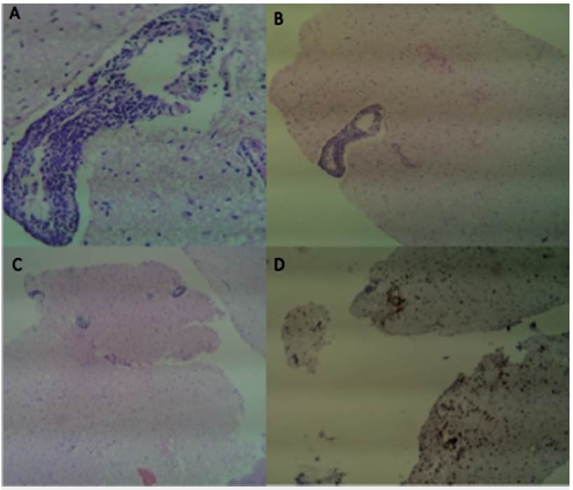 Figura 3: Coloración hematoxilina y eosina en diferentes aumentos A. 40X. B. 10X. C. 4X. D. Marcador de inmunohistoqumica CD34 que resalta las células endoteliales de las estructuras vasculares. Muestra el parénquima cerebral con proceso infiltrativo linfoide policlonal predominantemente T con localización perivascular que plantean como primera posibilidad diagnóstica vasculitis cerebral.