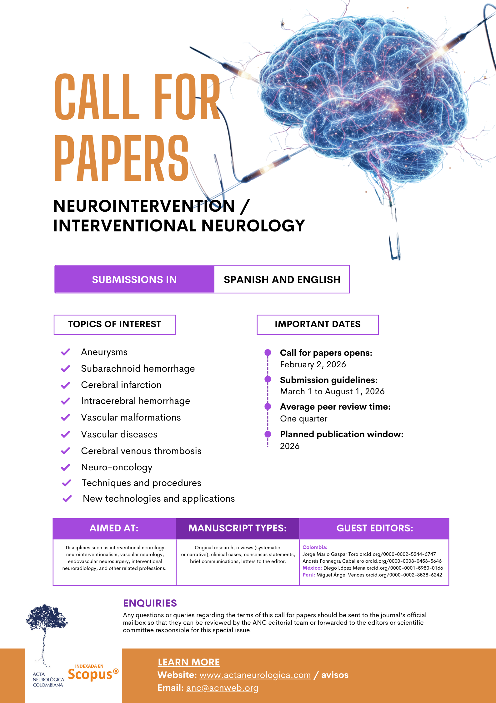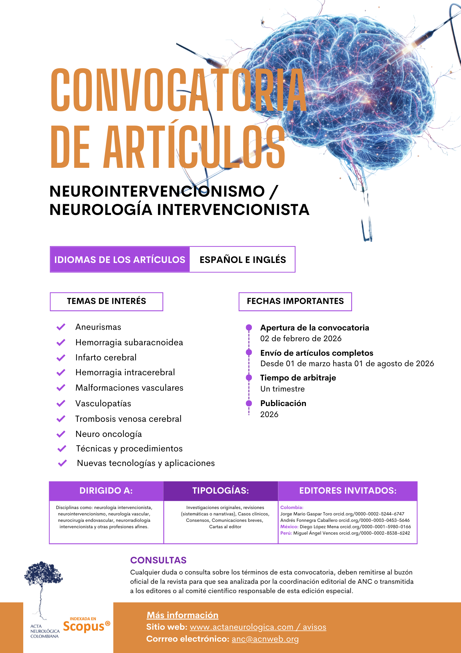Acta Neurológica Colombiana invites authors from all countries to submit their articles for a special issue on Neurointerventionalism
