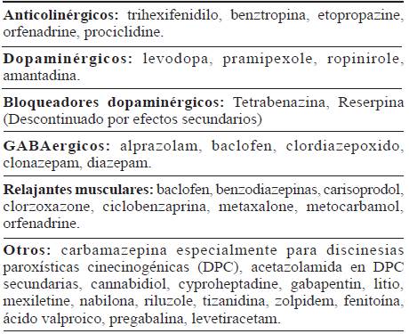 Los medicamentos orales se recomiendan principalmente para el tratamiento de distonía segmentaria y generalizada. La tabla 2 muestra las opciones orales que se han usado, incluyendo las que están disponibles en el país y otras no disponibles que se pueden tener en cuenta en caso de que indicado.