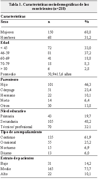 Se entrevistaron 218 convivientes (C) de igual número de personas (P) en riesgo de ACV. Hubo 150 mujeres entre los C y 146 entre las P, lo que equivale a dos tercios de la muestra estudiada. El promedio de edad de C fue 50,9 ±15 años (rango: 17 a 89 años) y de las P 73,1± 8 años (rango: 60 a 98 años). Casi la mitad (46,3%) de los C fueron hijos (75% mujeres), una cuarta parte (23,4%) fueron cónyuges y 13,7% convivientes ajenos a la familia. El nivel educativo de los C fue algún grado de secundaria en casi la mitad, seguido del nivel técnico/profesional. Predominó el tipo de acompañamiento “continuo” en 61,9% de los casos y el estrato socioeconómico mayoritario fue el medio, con cifras similares para estratos bajo y alto. Las variables sociodemográficas completas de los convivientes pueden verse en la Tabla 1.