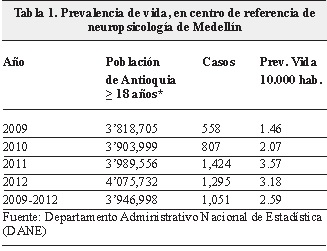 La Unidad de Neuropsicología realizó 17,929 atenciones entre los años 2009 y 2012, lo cual representó 9,091 pacientes atendidos al menos una vez durante los cuatro años del estudio. Entre estos, 4,084 (44.9%) fueron adultos mayores de 18 años. Si consideramos que esta Unidad es un centro de referencia para Antioquia, estaríamos hablando de prevalencia de vida por año con patología neuropsicológica atendidas en promedio de 2.6 (rango 1.46-3.57) por cada 10,000 habitantes (Tabla 1).