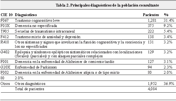 Se realizó un análisis para todo el grupo de pacientes y otro por subgrupos de acuerdo a las edades. Se estudiaron las variables de edad, sexo y diagnóstico. Entre los años 2009 y 2012, consultó al servicio de neuropsicología una población de 4,084, adultos, de los cuales el 57.35% fue de sexo femenino. Los diagnósticos principales de la población fueron: trastorno cognoscitivo leve (31.4%), demencia no especificada (9.2%) y secuelas de traumatismo intracraneal (5.4 %) (Tabla 2).