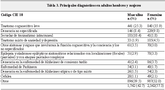 En los pacientes tanto femeninos como masculinos el diagnóstico principal fue trastorno cognoscitivo leve (25.3 y 35.9%), el segundo diagnóstico en hombres fue secuelas de traumatismo intracraneal (10.4%), mientras que el sexo femenino fue demencia no especificada (9.8%) (Tabla 3).