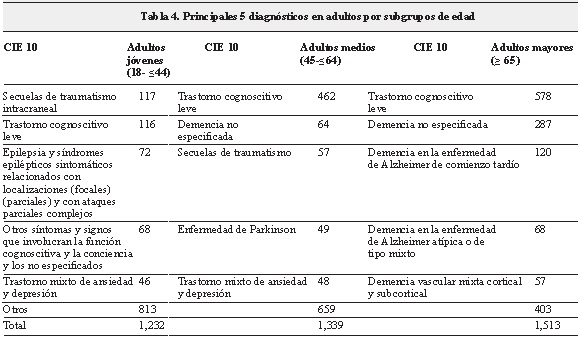 Respecto del análisis de acuerdo a la edad, en el subgrupo de adultos jóvenes el principal diagnóstico fue secuelas de traumatismo intracraneal (117 pacientes), en los adultos medios el trastorno cognoscitivo leve (462) al igual que en el subgrupo de adultos mayores (578) (Tabla 4).