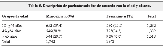De los tres subgrupos según la edad, en los hombres el más numeroso fue el de adultos jóvenes (652 pacientes); por otra parte, el subgrupo de adultos mayores fue el más grande en las mujeres (1,513 pacientes) (Tabla 5).