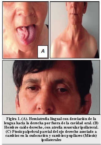 El examen físico se encontraba dentro de los límites normales, con signos vitales como se resume a continuación: tensión arterial: 120/70; frecuencia cardiaca: 68; frecuencia respiratoria: 16; temperatura: 37.2 °C. En el examen neurológico se evidenció una elevación asimétrica del velo del paladar, con un reflejo nauseoso exaltado. Se documentó una disfonía continua, no fluctuante, con tono agudo y voz susurrante. Presentaba hemiatrofia lingual derecha, con fasciculaciones espontaneas y desviación de la lengua hacia la derecha cuando se encontraba por fuera de la cavidad oral. Se evidencio ptosis palpebral parcial del lado derecho (Figura 1). El examen motor evidenció limitación para la elevación del hombro derecho, con asimetría en posición primaria y compromiso de los siguientes grupos musculares: Trapecio, deltoides y supraespinoso (Figura 1). El resto del examen neurológico se encontraba dentro de límites normales.