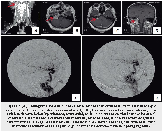 Se realizó una Tomografía axial de cuello, que evidencio una lesión hiperdensa, retrofaringea, en el angulo yugulo timpánico, que parecía depender de una estructura vascular, y que era congruente con los hallazgos de la resonancia cerebral. La resonancia mostró una lesión extra axial, que comprometía algunas estructuras óseas de la base del cráneo. La angiografía de vasos de cuello, evidenció una lesión altamente vascularizada, retrofaringea, del angulo yugulo timpánico, que por las características radiológicas sugería un paraganglioma (Figura 2). Los hallazgos imagenológicos eran congruentes con las alteraciones del examen neurológico, por lo que se confirmó el diagnóstico de síndrome de Villaret secundario a un paraganglioma del espacio retrofaringeo.
