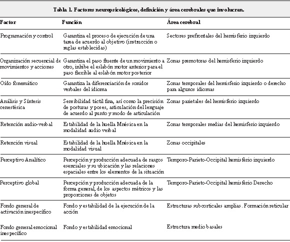 En la Tabla 1 se presentan algunos factores que participan en las diversas tareas cognitivas, su función y las áreas cerebrales que involucran (4). Se considera que estos factores son insuficientes para explicar todos los procesos cognitivos, en especial los más elaborados como: abstracción, análisis, síntesis, toma de decisiones, etc.