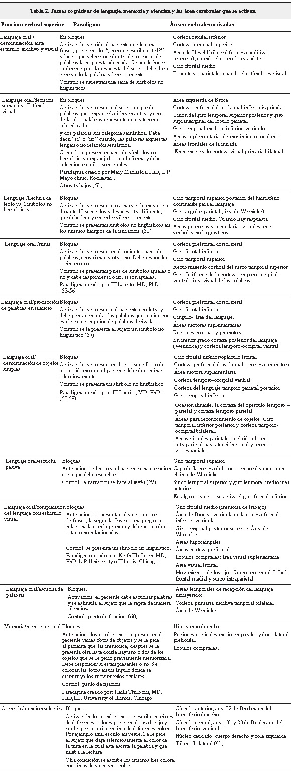 Se presentan a continuación, en la Tabla 2, las áreas que se activan ante diferentes paradigmas, obtenidas en estudios con sujetos sanos, sin antecedentes neurológicos, metabólicos, psiquiátricos o que reciban tratamientos farmacológicos.