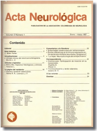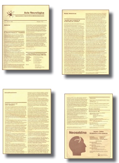 Los doctores Mario Muñoz neurólogo de la Universidad Nacional (HSJD), por la época vinculado a la Fundación Clínica A. Shaio y Pablo Lorenzana Pombo médico internista de la Universidad del Rosario y neurólogo de la Universidad de Londres a su vez Instructor Asociado, del programa de Neurología, en la Universidad Nacional de Colombia fueron los primeros editores. Los casi obligados temas del primer número cubrieron la historia de la Neurología (A. Rosselli) y la visión de la profesión y de la Asociación en el país (E. Palacios). En 1987 el Dr. Jimmy Schiemman (Neurólogo Javeriano -FINC), reemplazó al Dr. Lorenzana, quien pasó a ser editor asociado en compañía de los doctores Germán E Pérez R (UN-HSJD), Miguel Dávila S, y Guillermo Gómez (UR). La publicación misma tenía un aspecto muy juvenil, 8 caras compaginadas sin lomo ni costura, de papel amarillo y letras impresas en sepia, sin índice, ni tablas, ni figuras. Los artículos se solicitaban a los neurólogos (en particular a los profesores de los diversos servicios) y solían tener al final algunas bibliografías, casi siempre ordenadas alfabéticamente. El número 2 del volumen 2 de 1986 apareció con un grupo editorial nacional y un grupo de editores consultores internacionales, entre ellos Gustavo Román-Campos y Jorge Kattah, y estaba acompañado de un índice que avisaba secciones novedosas con artículos originales estructurados como el escrito por Palacios Leonardo con Resumen y Palabra clave (11). Contaba también con una “Página del Residente” que inauguraron Raúl Palma y Jairo Lizarazo del programa de la UN-HSJD con un artículo también organizado a la manera de las revistas internacionales (12). En junio de 1987 al final del número 2 del volumen 3, los editores expresaron su adhesión a los Requisitos Unificados para trabajos presentados a las Revistas Biomédicas (también conocidos como Requisitos Estilo Vancouver, desarrollados por la Biblioteca Nacional de Medicina (NIH-NL) a partir de la reunión de 1978 y publicados por vez primera en 1979, y transcribieron lo publicado por Acta Médica Colombiana (1983;8:43-47) (13).