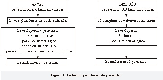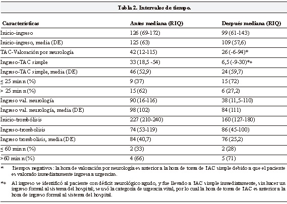 Se realizó un estudio de antes y después. Se incluyeron pacientes mayores de 18 años que ingresaron al servicio de urgencias con signos clínicos de alteración de la función cerebral de instauración aguda. Se excluyeron pacientes que tuvieran presencia de hemorragia en el TAC simple, hallazgo de una causa diferente al ACV que explicara los síntomas del paciente y el ataque isquémico transitorio. Se midieron datos demográficos: edad, sexo, antecedentes, así como los intervalos tiempo inicio de los síntomas-ingreso al triage, tiempo puerta-TAC, tiempo puerta-valoración por neurología, ingreso-trombolisis e inicio de los síntomas-trombolisis.