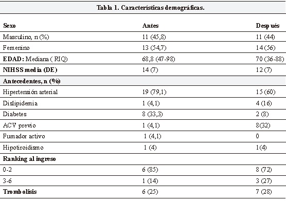 Antes y después, respectivamente, 45,8% y 44% fueron hombres. La media de edad antes fue de 68,8 años (DE 13) y después de 70 años (DE 12). El NIHSS en los dos grupos fue similar, siendo 12 antes y 14 después. Antes y después de la vía clínica 85% y 72% de los pacientes respectivamente presentaron un puntaje de Rankin de 0 a 2 (Tabla 1).
