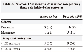 La toma de TAC simple dentro de los 25 minutos del ingreso fue mayor en pacientes con ingreso dentro de los 120 minutos del inicio de los síntomas antes 55% y 56% posterior a la implementación de la vía clínica; el género femenino se asoció con una mayor proporción de toma de TAC dentro de los primeros 25 minutos (Tabla 3).
