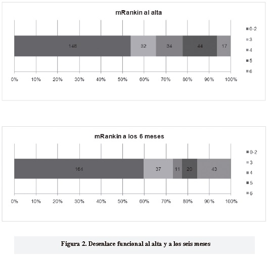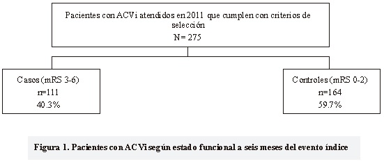 De los 275 pacientes, 111 (40,3%), presentaron desenlace funcional desfavorable (mRS 3-6) a los seis meses de seguimiento (Figura 1), para una relación caso:control de 1:1.5.