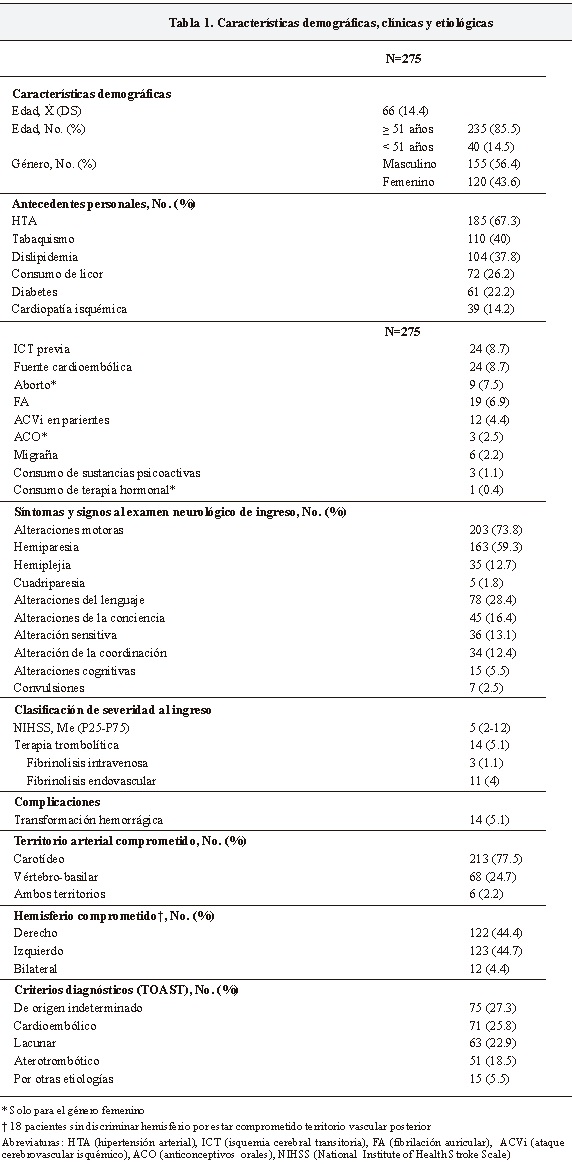 Durante el periodo de ejecución del estudio (año 2011) ingresaron al Indec 305 pacientes con diagnóstico de ACVi, de los cuales se excluyeron 30 para el análisis (por no tener seguimiento a los seis meses del ACVi); por lo tanto, al grupo de estudio lo conformaron 275 pacientes.