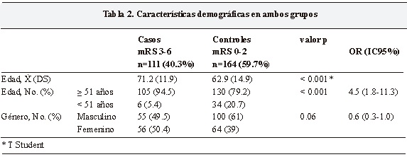 Materials and methods: Retrospective study of case-control adult stroke patients, a model of logistic regression was performed to identify predictors of an unfavorable functional outcome (mRS 3-6) at six months follow up. The entry of the variables was performed by the method steps forward (likelihood ratio) and evaluated the data fit the model using the Hosmer-Lemeshow. Adjusted ORs were estimated with the model coefficients and their confidence intervals and p value.