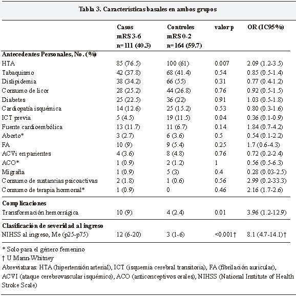 La comparación entre grupos se observa en las Tablas 2 y 3, encontrándose diferencias estadísticamente significativas en las variables: edad, antecedentes de hipertensión arterial e isquemia cerebral transitoria, puntaje NIHSS al ingreso y transformación hemorrágica durante la evolución hospitalaria.