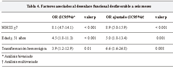 En el análisis multivariado los factores más fuertemente asociados con el desenlace funcional desfavorable a seis meses fueron: puntaje NIHSS al ingreso ≥ 7 (OR 8,96, IC 95%: 5,02-15,99), edad de 51 años o más (OR 5,0, IC 95%: 1,86-13,40) y presentar transformación hemorrágica (OR 6,61, IC 95%: 1,6-26,87) (Tabla 4).