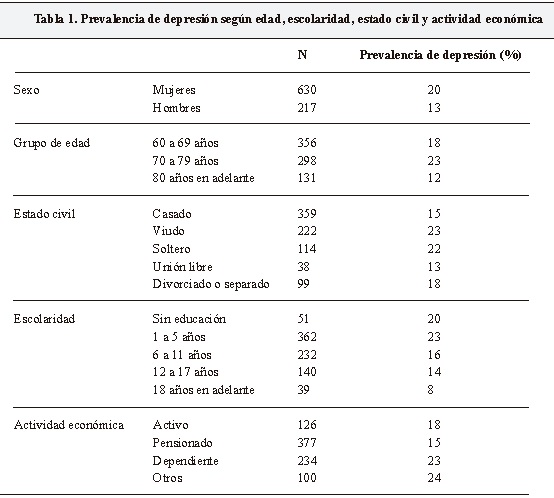 Se encontró una prevalencia de depresión del 18,6% (IC 99%: 15,13-22,07%); 16% (130 sujetos) se encontraban en estadio leve y moderado (puntuaciones 6-10 en la Edagy), y 3% (26 sujetos) en estadio severo (puntuaciones 11-15 en la Edagy). La prevalencia en mujeres fue de 20% (IC 99%: 16,14-24,46%) y en los hombres de 13% (IC 99%: 7,10-18,59%). Se encontró mayor tendencia a la depresión en el grupo de adultos entre 70-79 años, viudos o solteros, y en sujetos con más baja escolaridad y/o dependencia económica (Tabla 1).