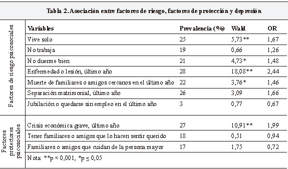 Resultados: el 74% de la muestra estuvo constituida por mujeres, la media de edad fue de 72,51 (DS 9,4) años y la escolaridad promedio en años fue de 7,50 (DS 5,64). Así mismo, se estimó una prevalencia de depresión del 18,6%, siendo mayor en mujeres (20%) y (18%) en sujetos entre 70 y 79 años, los adultos con baja escolaridad sumaron un 43%, y el 22% lo constituyeron personas dependientes económicamente. Por otra parte, se encontró relación entre la depresión y cinco de los factores de riesgo psicosocial conocidos como acontecimientos vitales adversos: insomnio, vivir solo, padecer enfermedades crónicas, haber sufrido una crisis económica, y la muerte de un familiar o amigo cercano en el último año.