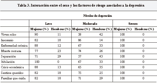 Se efectuó una regresión logística para identificar si existe relación entre sexo, factores riesgo y presencia de depresión. El ser mujer se asoció positivamente con todos los factores de riesgo, y con mayor depresión que en el hombre (Tabla 3).