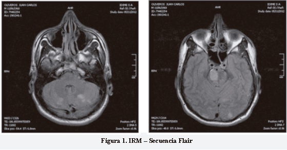Dentro de la activación del código ACV se consideró que el paciente cumplía los criterios de inclusión para trombólisis cerebral intravenosa y se aplicaron 70 miligramos de rTPA (factor activador del plasminógeno tisular recombinante) sin complicaciones postrombólisis. A las 36 horas posteriores al procedimiento se observó mejoría en la mirada conjugada con excursión de ambos ojos hacia la derecha y mejoría en la fuerza muscular a 3/5 en hemicuerpo izquierdo; el puntaje en la escala NIHSS disminuyó a 11. Se realizó imagen por resonancia magnética cerebral (IRM), y se observó en la secuencia Flair un infarto póntico derecho, cerebeloso y occipital bilateral con presencia de una imagen que sugirió un trombo en la bifurcación de la arteria basilar (Figura 1). Se solicitó estudio de dúplex de vasos supraaórticos, mediante el cual se evidenció una importante alteración de la morfología espectral de la arteria vertebral derecha con flujo diastólico aumentado sugiriendo una disección vertebral derecha. Los estudios de extensión para el diagnóstico diferencial cardiológico, hematológico y autoinmune fueron normales y el paciente evolucionó sin nuevas complicaciones, recuperó el déficit motor, la mirada conjugada se normalizó y 6 días después se dio de alta para manejo ambulatorio con una discapacidad en la escala modificada de Rankin de 2/6.