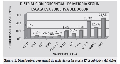 Posteriormente se valoró en ellos la efectividad de tratamiento, indagando de manera subjetiva la mejoría por medio de la escala visual análoga del dolor (EVA).