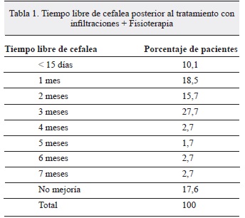 El tiempo libre de cefalea postratamiento varió entre uno y doscientos diez días (siete meses), al respecto el mayor porcentaje de pacientes refieren haber estado asintomáticos en promedio durante noventa días (Tabla 1).