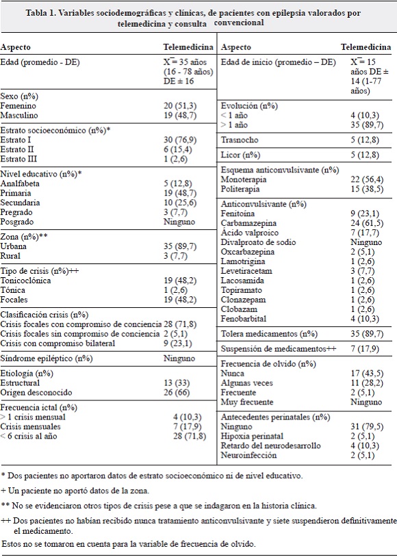 Se tomaron de los pacientes los datos sociodemográficos, luego se recolectaron los datos clínicos durante la consulta médica por telemedicina, registrando el comportamiento y curso de la enfermedad, el tipo de epilepsia mediante el diagnóstico por ejes de la ILAE, la frecuencia de crisis, los desencadenantes y los antecedentes del paciente. Una vez finalizada la consulta médica, se diligenció el instrumento de evaluación de la satisfacción de los pacientes y el neurólogo en la consulta de telemedicina, por medio de un cuestionario que consta de diecinueve preguntas tomadas de una escala aplicada en Canadá (6) y adaptadas a nuestro lenguaje e idioma. Esta herramienta está diseñada de acuerdo con una escala de Thurstone que consta de cinco alternativas de respuesta: "muy en desacuerdo", "en desacuerdo", "neutral", "de acuerdo", "muy de acuerdo". Se hizo una evaluación previa al diligenciamiento de la escala con la finalidad de determinar el entendimiento de las variables incluidas en el cuestionario. Además, se aplicó un cuestionario de siete preguntas con tres alternativas: "excelente", "bueno" y "malo", para evaluar variables técnicas del sistema, al igual que se diseñó un sistema de reporte de eventos adversos durante la consulta de telemedicina que fue utilizado antes en una prueba piloto.