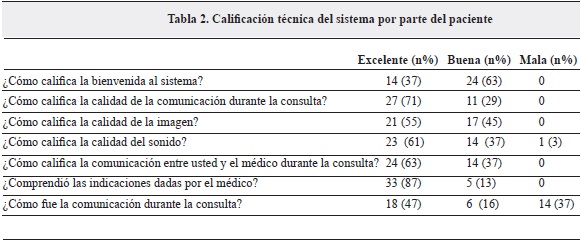 Se evaluaron durante el proceso de telemedicina las variables técnicas desde el punto de vista del usuario. En la variable "bienvenida al sistema" el 63% de los pacientes la calificó como buena y 17% excelente. La "calidad de la comunicación" el 71% la calificó de excelente y 29% buena. En cuanto a la "calidad de la imagen" para el 55% fue excelente y para el 45% buena. En la calidad del sonido 61% la percibió excelente, 37% buena y 3% mala. Al interrogarse si se comprendieron las indicaciones dadas por el médico, 87% respondió que fueron "excelentes" y un 13% opinó que "buenas" (Tabla 2).