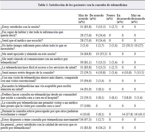 Durante el registro de las encuestas electrónicas no se registraron en el sistema dos de las treinta y nueve encuestas realizadas (5,1%). La satisfacción de los pacientes con la consulta de telemedicina fue calificada como "muy de acuerdo" en el 83,8%. El 81,1% se sintió cómodo comunicándose con el médico por telemedicina, y creen además que esta hace fácil el acceso a los servicios de salud en un porcentaje alto: 83,8%. Los pacientes ven la telemedicina como una vía aceptable para recibir atención en salud en un 91,9%, y 94,6% consideran que ahorran más dinero en comparación con la visita convencional. En cuanto a la oportunidad de consulta todos los pacientes opinaron que la telemedicina les permite tener una valoración por el especialista más rápido que mediante la consulta convencional (Tabla 3).