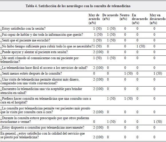 Asimismo, se evaluó la satisfacción de dos neurólogos respecto de la consulta guiada por telemedicina, y sus respuestas se distribuyeron uniformemente entre "muy de acuerdo" y "de acuerdo"; ambos afirman que la telemedicina hace fácil el acceso a los servicios de salud, además de ser una vía aceptable para recibir atención en salud (Tabla 4).