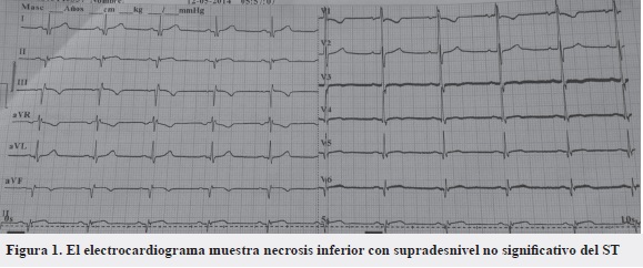 Durante la hospitalización, dos días después del ingreso, realiza episodio de dolor torácico retroesternal, opresivo, intenso (9/10), continuo de seis horas de duración, asociado a disnea y pico febril cuantificado en 39 °C. Se sospecha evento de pericarditis, por lo que se realiza electrocardiograma (ECG), el cual fue realizado tres horas después del inicio de los síntomas. Los hallazgos son sugestivos de infarto agudo de pared inferior (Figura 1) y se decide evaluar con biomarcadores de necrosis cardiaca, los cuales se encuentran notablemente elevados: troponina T inicial, tomada a las seis horas del inicio de los síntomas, en 41.039 pgr/dl, con control a las cuatro horas posteriores de la primera muestra de 36.170 pgr/dl. Se realiza ecocardiograma, tomado a las treinta y seis horas posteriores de presentar el cuadro clínico de dolor torácico, que muestra fracción de eyección de 54%, hipoquinesia inferior y derrame pericárdico leve.