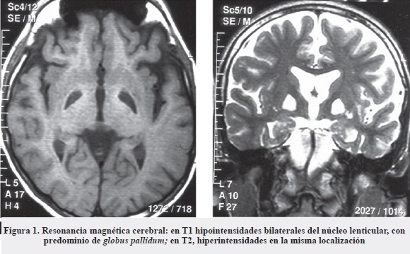 Al sexto día de evolución se realizó una resonancia magnética cerebral (Figura 1) que reportó áreas de hipodensidad bilateral en los ganglios basales, con mayor compromiso del globus pallidum y en menor grado del putamen.