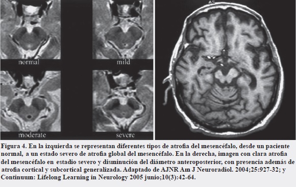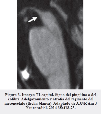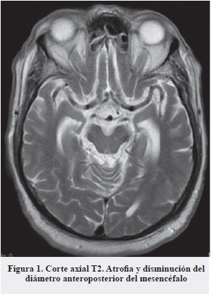 En nuestro caso la realización de la resonancia de cerebro constituyó una herramienta muy útil que, además de argumentar la sospecha clínica inicial, sirvió para descartar otras lesiones estructurales asociadas a caídas frecuentes (hematomas, hidrocefalia a presión normal, etc. ). Los hallazgos característicos de esta enfermedad son, principalmente, la atrofia del tegmento del mesencéfalo (Figura 2) en proyección sagital (signo del colibrí o del pingüino) (Figura 3) (16, 17), la alteración del diámetro anteroposterior y la atrofia generalizada del mesencéfalo (Figura 4) (18).