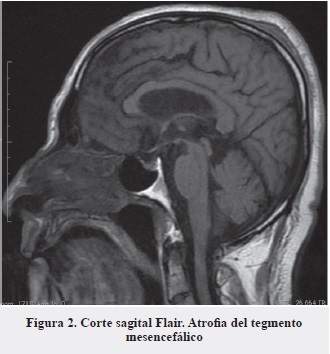 Al ingreso se registraron los siguienes paraclínicos: glucemia basal 166 mg/dL; cloro: 92; potasio: 4,84; sodio: 123, creatinina: 0,74; BUN: 11,7; PT: 10,5; PTT: 25,8; INR: 0,97. Hemograma: leucocitos: 11,6; neutrófilos: 9,6; linfocitos: 1,36; Hgb: 8,51; VCM: 90; Htcto: 24,5; Plaq: 292.000. Posterior a valoración inicial se obtuvieron paraclínicos de vitamina B12: 189; VIH: no reactivo; VDRL: no reactivo; ácido fólico: 14,2; TSH: 1,12; Hgb glicosilada: 6,6. Desde el punto de vista neurológico, dada la presencia de caídas frecuentes, parkinsonismo sin respuesta a levodopa y parálisis de la supraversión de la mirada, se complementó estudio con una resonancia magnética de cerebro (Figura 1) en la que se evidenciaron hallazgos sugestivos de parálisis supranuclear progresiva.