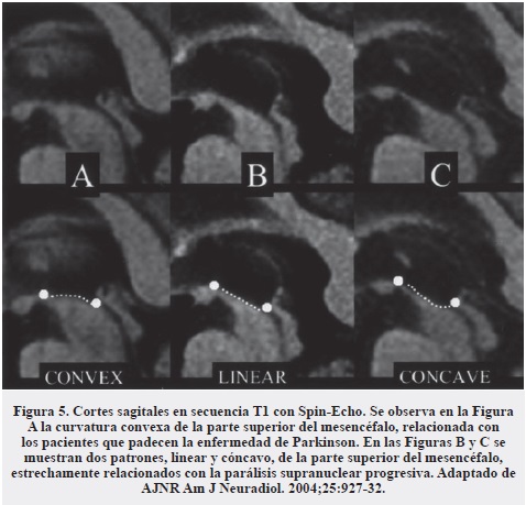Un aspecto de particular utilidad de la IRM en el diagnóstico diferencial con enfermedad de Parkinson idiopática es la evaluación de la morfología de la curvatura del tegmento del mesencéfalo (Figura 5), la cual conserva su forma convexa habitual en la EP, mientras que en la PSP puede observarse recta o cóncava (18).