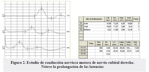 - Respuestas motoras de cubital derecho con latencias prolongadas a predominio proximal, resto de los parámetros dentro de límites normales (Figura 2). Respuestas izquierdas con morfología abigarrada y duraciones prolongadas en todos los tramos, resto de los parámetros dentro de límites normales.