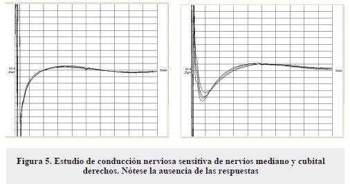 - Ausencia de respuesta sensitiva (bloqueo total de la conducción) en ambos nervios medianos y cubitales (Figura 5).