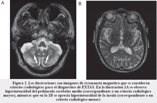 Sin embargo, las manifestaciones clínicas por sí solas no permiten realizar un diagnóstico certero de FXTAS, el cual debe contar con la presencia de ciertos hallazgos radiológicos específicos, tales como la hiperintensidad del pedúnculo cerebelar medio (MCP por las siglas en inglés de Medium Cerebellar Peduncle) observada en imagen de resonancia magnética de cerebro (Figura 2A), aunque este no es patognomónico. Pese a ello, constituye un criterio radiológico mayor (5) que debe ir acompañado de los criterios clínicos no radiológicos mencionados para constituir un diagnóstico. El signo de MCP solo se encuentra en el 60% de los hombres y el 13% de las mujeres con FXTAS; estos pacientes presentan un déficit cognitivo más severo y una historia más larga de síntomas de degeneración neurológica que los individuos con FXTAS sin él.