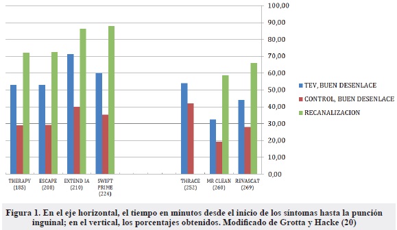 Hay dos tiempos de respuesta que entran en el análisis del porqué de los buenos resultados. El primero de ellos es el intervalo entre el inicio de los síntomas y el inicio del tratamiento con rtPA IV, y el segundo entre el inicio de los síntomas hasta lograr la recanalización por TEV. El tiempo entre el inicio de los síntomas y la punción de la ingle fue menor en el EXTEND IA y en el ESCAPE. En la mayoría de estudios el rtPA IV se administró a la casi totalidad de los pacientes en las dos primeras horas (Figura 1).