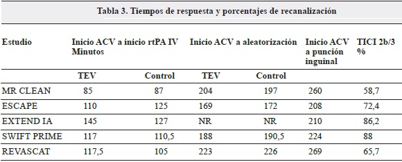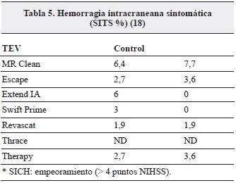 La hemorragia intracraneana sintomática no aumentó significativamente en ninguno de los dos grupos y el mayor porcentaje observado en MR CLEAN se atribuye a que no se seleccionaron los pacientes con imágenes avanzadas y al mayor tiempo de inicio de la TEV (Tabla 5).