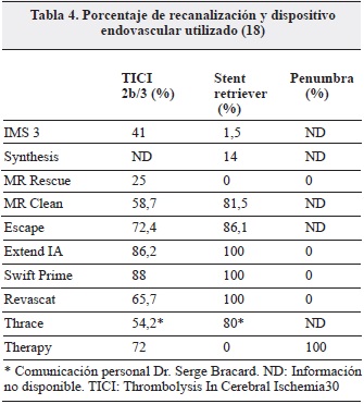 La utilización casi en su totalidad de dispositivos stent retriever y de aspiración en los siete estudios analizados en este artículo, comparados con los estudios del 2013, donde predominaron los de primera generación, contrasta en los resultados de desenlace favorable con mRS 0-2 y en las tasas de recanalización (17, 23). Sin embargo, tampoco ninguno de estos nuevos estudios fue diseñado para demostrar la superioridad de los stent retriever sobre otras modalidades de dispositivos intravasculares, v. gr. Penumbra o de aspiración (Tabla 4).