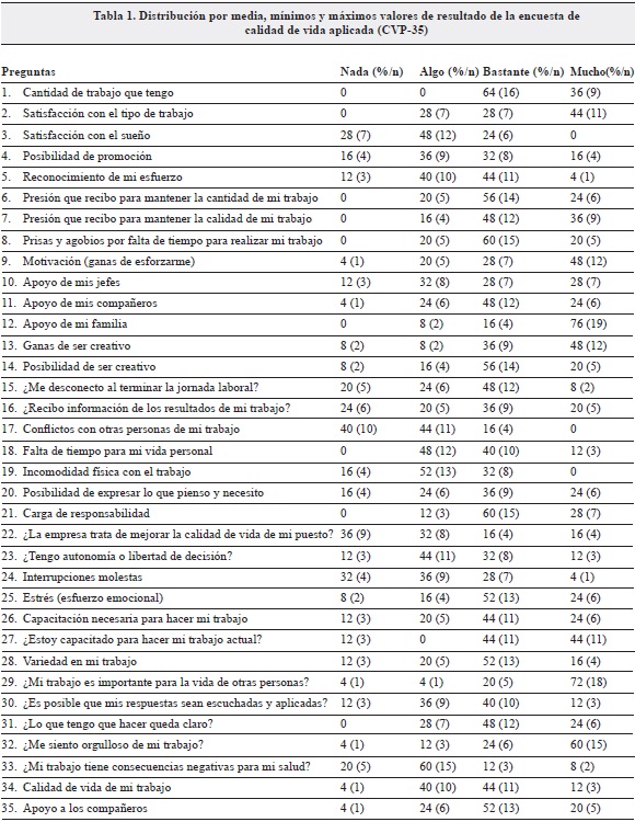 A continuación se revisan las preguntas del cuestionario de calidad de vida profesional (CVP-35). Se describe la cantidad de porcentaje de los resultados en la escala del 1-10 y la distribución estadística se muestra en la Tabla 1. Se analizan, por su importancia específica, algunas preguntas de la encuesta.