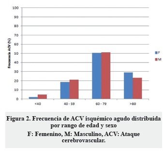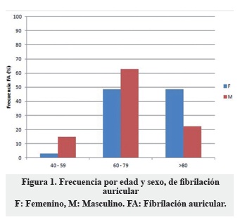 En el grupo de ACV con fibrilación auricular 45% eran al sexo masculino, mientras que en aquellos sin FA correspondió al 62,5% (OR 0,49 95%; IC 0,26-0,92; p = 0,018). Hubo mayor frecuencia de ACV entre los 60 y 79 años; asimismo, hubo mayor asociación entre ACV y fibrilación auricular a partir de los 60 años (Figuras 1 y 2).