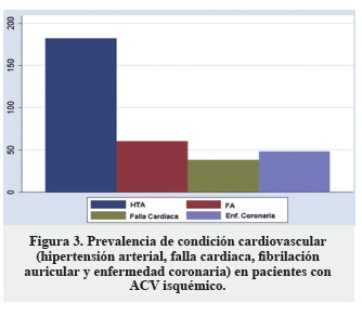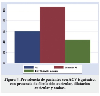 En nuestro estudio se evidencia que el principal factor de riesgo asociado a ACV isquémico agudo fue hipertensión arterial (como ha sido ampliamente reportado en la literatura), seguido de dilatación auricular, enfermedad coronaria, tabaquismo, diabetes mellitus y antecedente de falla cardiaca. En los pacientes con ACV isquémico agudo con fibrilación auricular el factor de riesgo más prevalente fue el antecedente de falla cardiaca, seguido de dilatación auricular documentada en ecocardiograma, enfermedad coronaria, hipertensión arterial, tabaquismo y diabetes mellitus.