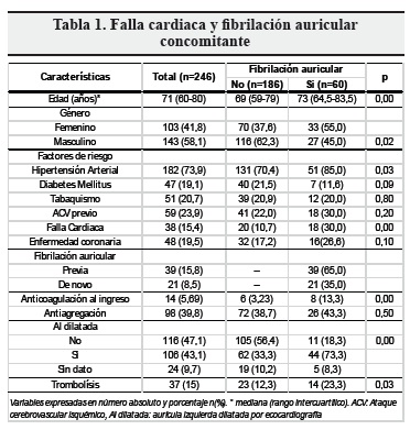 Se observó también falla cardíaca en el 15,4% de los pacientes, y de este grupo el 47,3% presentaba además fibrilación auricular concomitante (OR 3,5 95%; IC 1,6-7,75; p = 0,000) (Tabla 1).