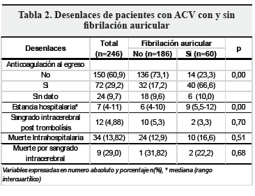 Durante el periodo enero de 2011 a diciembre de 2012 se presentaron en la Fundación Valle del Lili 1.500 pacientes con diagnóstico de ACV. De estos, 246 cumplieron los criterios de inclusión. La mediana de edad fue de 71 años, con un rango intercuartílico de 60-80 años, la mitad hombres, y entre los factores de riesgo se encontró un 24,3% de pacientes con fibrilación auricular.