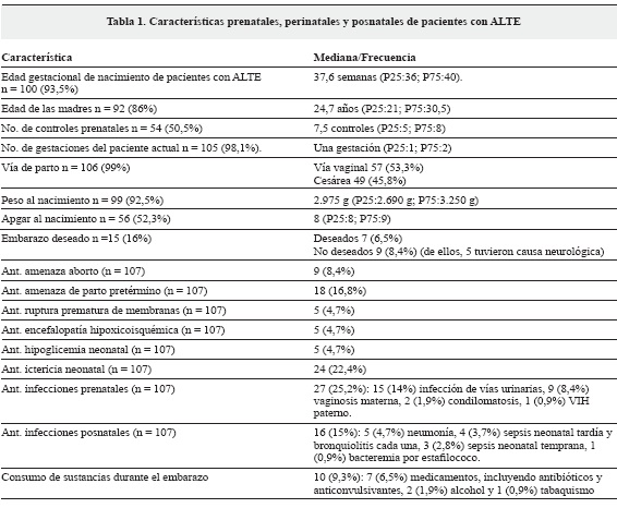 En total se incluyeron 107 pacientes, 60 (56,1%) de sexo masculino; 104 (97,2%) de procedencia urbana; la mediana de edad en la presentación de ALTE fue de 75 días (P25:34; P75:89); en 52 pacientes (48,6%) este fue su primer episodio de ALTE y 1 (0,9%) presentó el máximo de episodios en su vida: ocho.