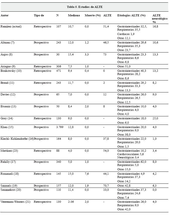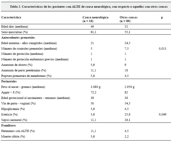 El ALTE es una condición que pone en riesgo la vida de los lactantes, por lo tanto deben realizarse acciones para definir la etiología y tratamientos adecuados a fin de evitar complicaciones. Las causas neurológicas corresponden a un número importante de este grupo, que en este estudio es del 16,8%, lo cual concuerda con datos observados en otros estudios, en los que esta frecuencia varía entre 0 y 23%, pero con tendencia a cifras más bajas, encontrándose en el presente estudio mayor frecuencia con respecto a otros (7) (Tabla 5).